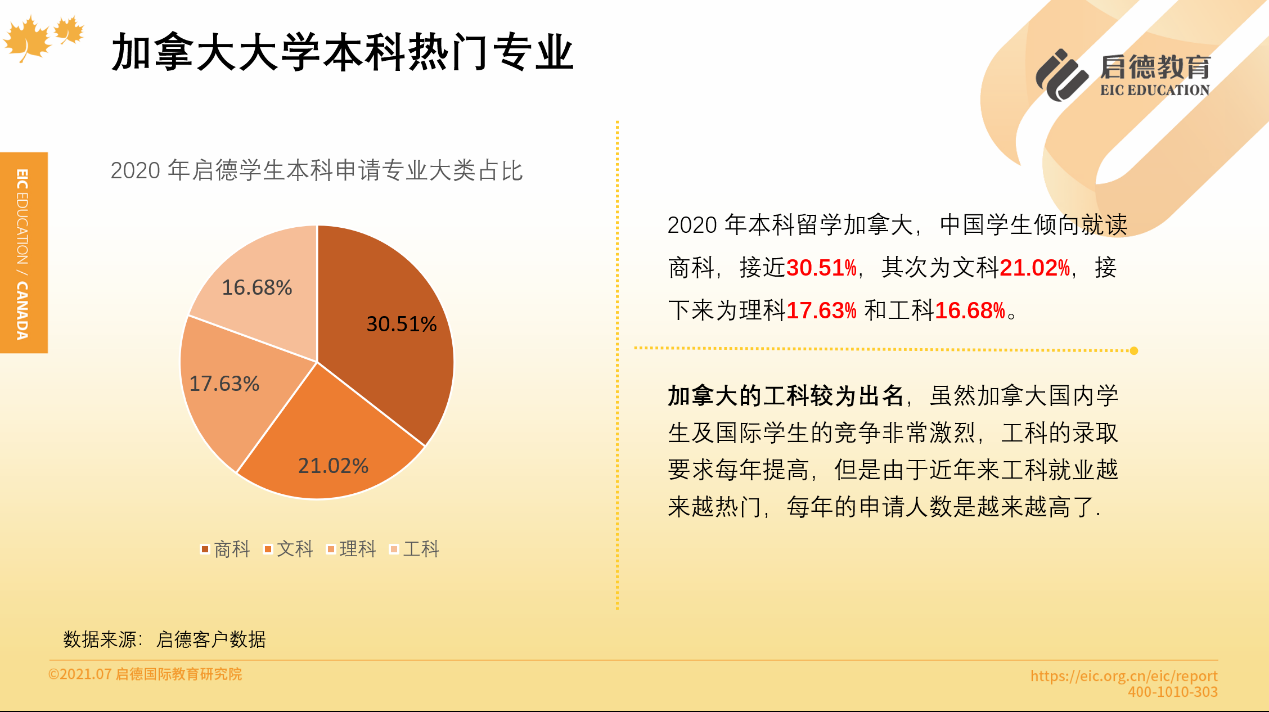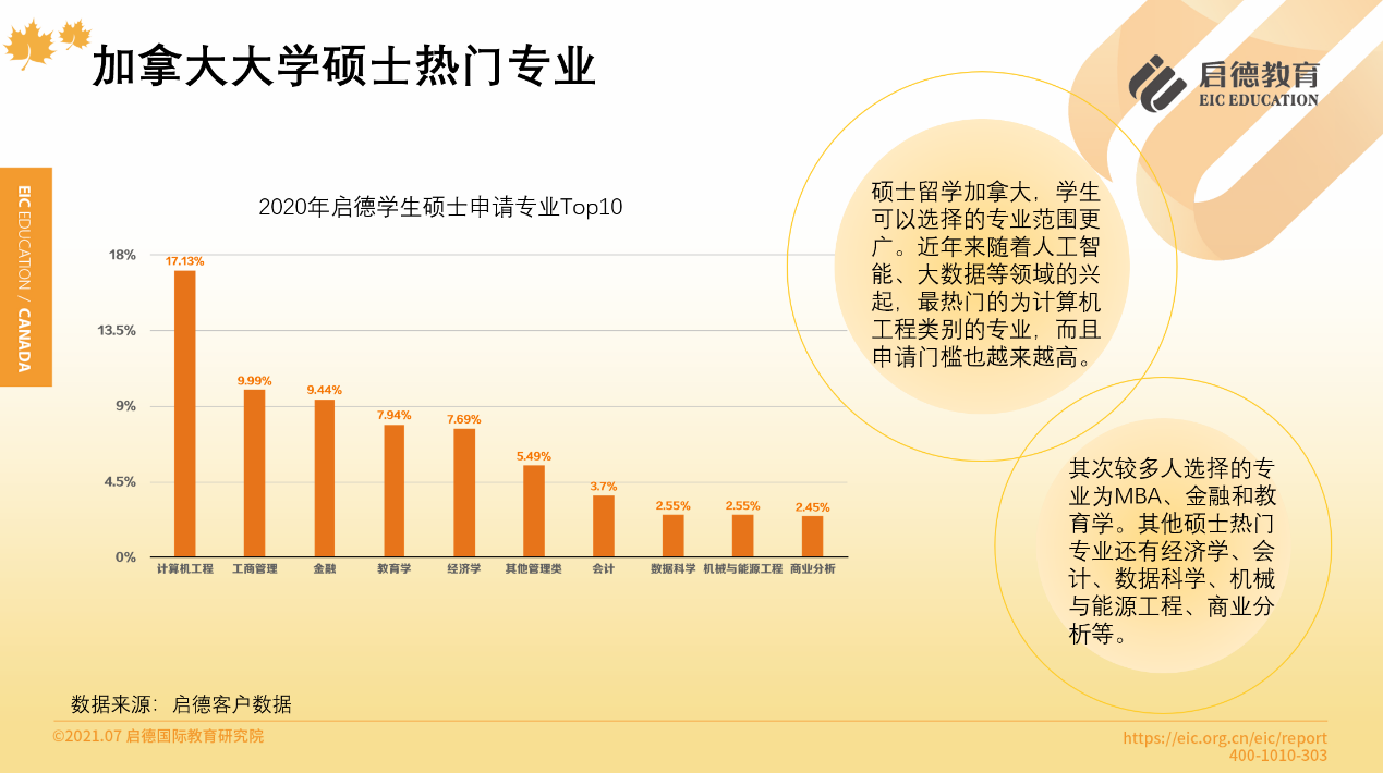 啟德留學(xué)客戶服務(wù)數(shù)據(jù)顯示,2020年加拿大本科階段,理工科專業(yè)占比34.31%,商科占比30.51%,文科21.02%,理工科的申請人數(shù)超過了商科。碩士階段選擇最多的專業(yè)是計算機(jī)工程(17.13% )、 MBA (9.99% )、金融(9.44% )與教育學(xué)(7.94% ),其他碩士熱門專業(yè)還有經(jīng)濟(jì)學(xué)、會計、數(shù)據(jù)科學(xué)、機(jī)械與能源工程、商業(yè)分析等。