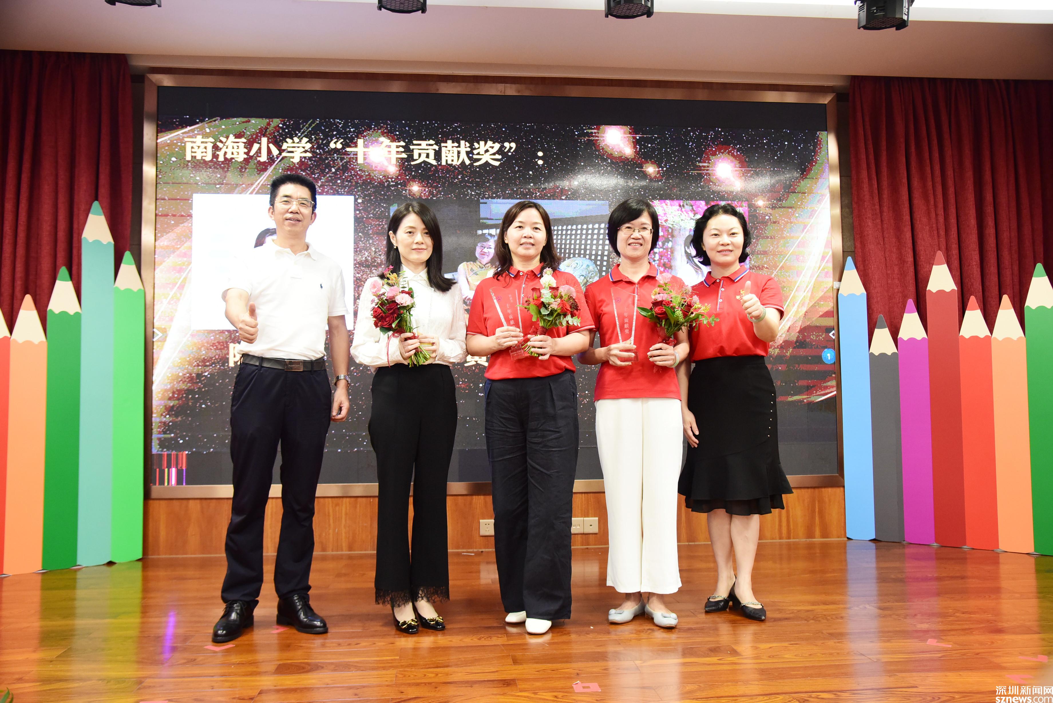 大會(huì)頒發(fā)了南海小學(xué)“十年貢獻(xiàn)獎(jiǎng)”、南海小學(xué)特別貢獻(xiàn)獎(jiǎng)、教學(xué)質(zhì)量獎(jiǎng),也對(duì)南山區(qū)優(yōu)秀教師、南山區(qū)優(yōu)秀班主任、入圍南山區(qū)2021“年度教師”決賽教師等進(jìn)行了表彰。入圍南山區(qū)2021“年度教師”決賽的李艷老師、青年教師代表方子玉老師上臺(tái)分享了她們的教育教學(xué)經(jīng)驗(yàn)與成長(zhǎng)心路歷程,李艷老師說:“我不僅僅是一名英語(yǔ)教師,更是孩子們的夢(mèng)想合伙人!”方子玉老師說:“南山就是一塊永遠(yuǎn)充滿學(xué)習(xí)熱情的沃土,南海更是一所不斷為青年教師搭建學(xué)習(xí)平臺(tái)的寶藏學(xué)校?!?/p>
