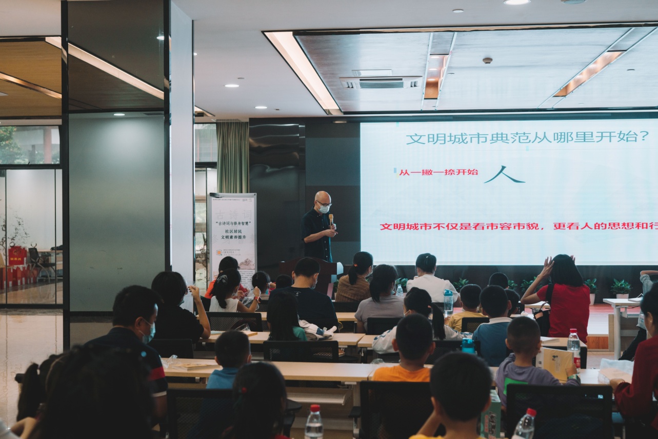 讀特客戶端·深圳新聞網(wǎng)2021年11月1日訊(記者 陳彬 通訊員 林娟玉 楊婷姻 )10月31日下午,由南山區(qū)文明辦、南山新時(shí)代文明實(shí)踐中心指導(dǎo),桃源街道黨工委(辦事處)、桃源街道新時(shí)代文明實(shí)踐所主辦,福光社區(qū)黨委、福光社區(qū)新時(shí)代文明實(shí)踐站協(xié)辦,深圳市壹書文化傳播有限責(zé)任公司承辦的“‘古詩詞與修身智慧’社區(qū)居民文明素養(yǎng)提升”活動(dòng)在福光社區(qū)黨群活動(dòng)中心多功能室舉行,活動(dòng)吸引了60余名家長及小孩參與,本次活動(dòng)根據(jù)親子的特點(diǎn),形式生動(dòng)活潑,氣氛熱烈,受到現(xiàn)場(chǎng)觀眾的一致好評(píng)。