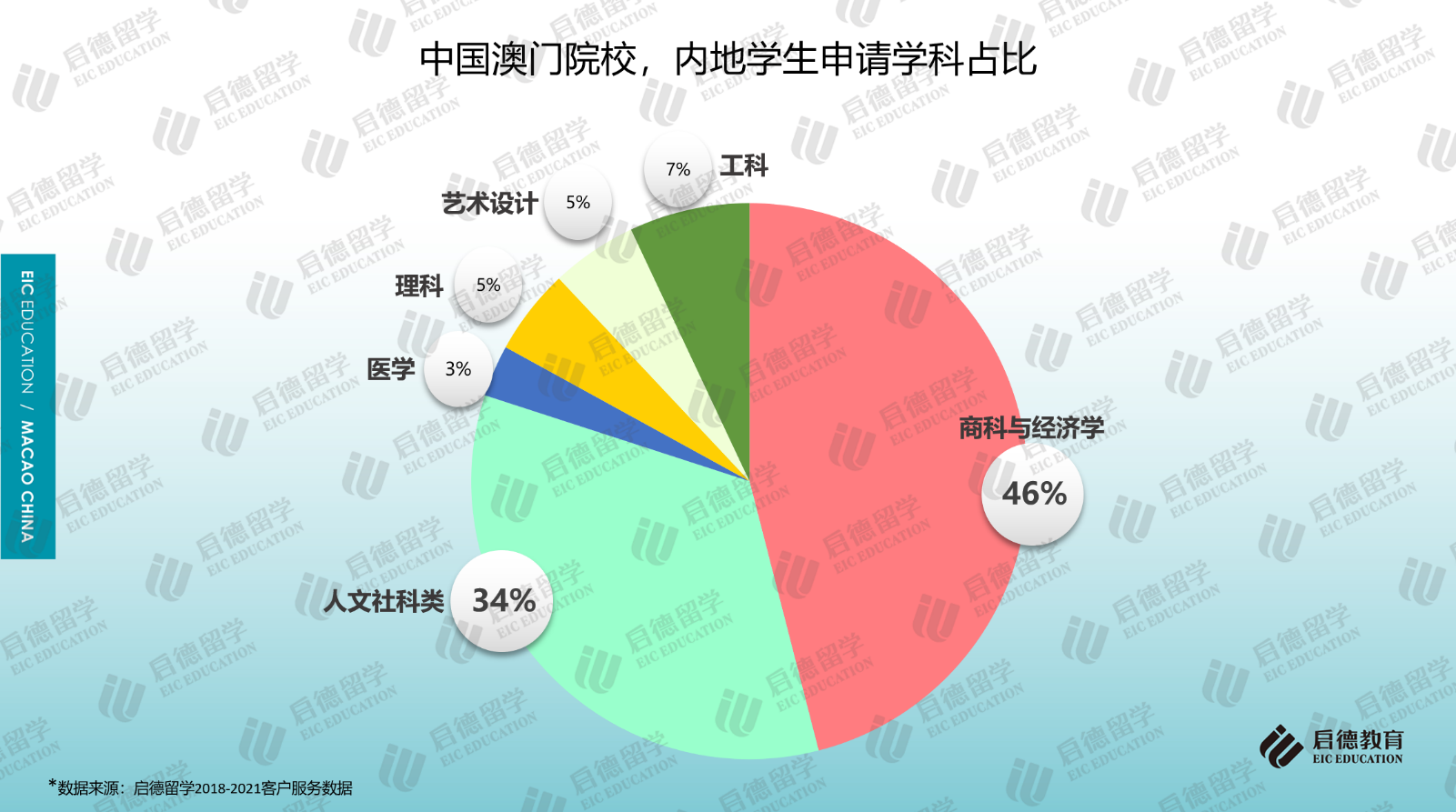 啟德留學(xué)2018-2021客戶服務(wù)數(shù)據(jù)顯示,商科與經(jīng)濟學(xué)(46%)、人文社科類(34%)、理工科(12%)在澳門高校的申請占比位居前三。在商科與經(jīng)濟學(xué)的細分專業(yè)中,工商管理、旅游與酒店管理、會計的申請占比超過6成;在人文社科類的細分專業(yè)中,傳媒、法學(xué)、語言學(xué)的申請占比超過6成;電子與計算機(55%)成為理工科選擇最多的專業(yè)。作為澳門求學(xué)的主要學(xué)科,澳門院校的商科碩士專業(yè)對GMAT/GRE考試不作硬性要求。