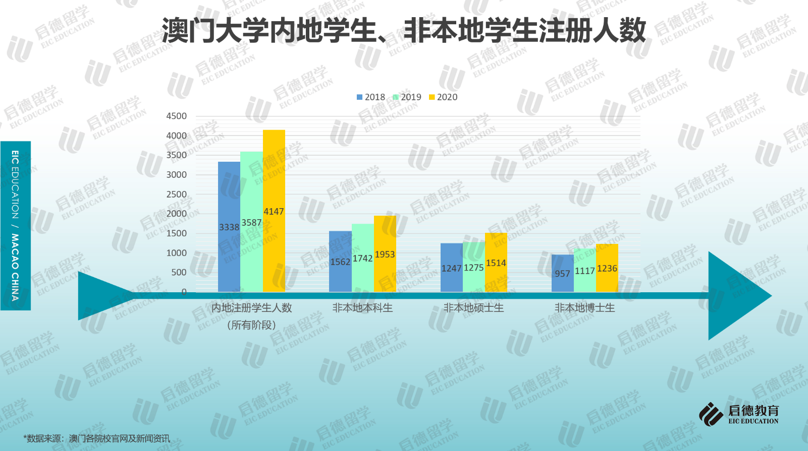 最近幾年,內(nèi)地學(xué)生赴澳門求學(xué)的人數(shù)保持增長,據(jù)澳門大學(xué)官網(wǎng)數(shù)據(jù)顯示,2020年,赴澳門大學(xué)求學(xué)的內(nèi)地注冊學(xué)生人數(shù)為4147人,相比2019年上漲了15.61%,相比2018年上漲了24.23%;2021/2022學(xué)年,澳門科技大學(xué)本科課程的內(nèi)地報名人數(shù)超過18000人,澳門城市大學(xué)本科課程的內(nèi)地報名人數(shù)接近13000人,計劃錄取866人,報錄比達到15:1。此外,2020年澳門大學(xué)本科(1953人)、碩士(1514人)、博士(1236人)階段的非本地生人數(shù)均呈穩(wěn)步上升,非本地學(xué)生包括來自中國內(nèi)地及其它國家與地區(qū)的學(xué)生。澳門高等院校的申請競爭遠比想象中激烈。