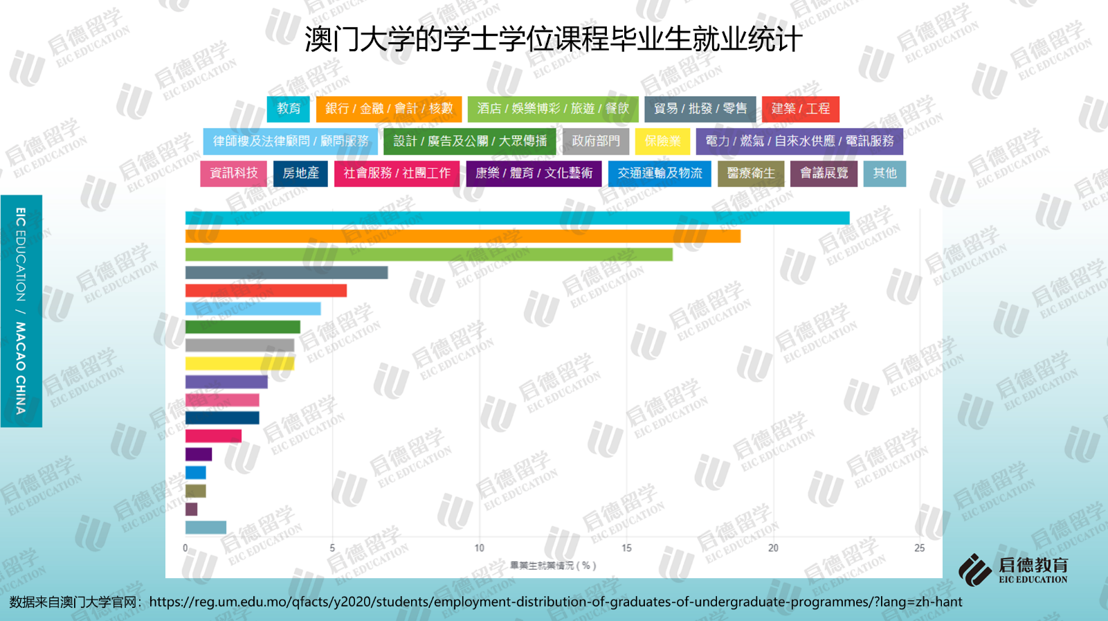 澳門大學(xué)2019/2020年本科畢業(yè)生就業(yè)調(diào)查顯示,畢業(yè)生就業(yè)人數(shù)最多的行業(yè)排名前三位為教育行業(yè)(22.6%)、銀行/金融/會計/核數(shù)(18.9%)、酒店/娛樂博彩/旅游/餐飲(16.6%)。澳門科技大學(xué)2018/2019學(xué)年本科畢業(yè)后去向調(diào)查顯示,就業(yè)的本地生中,4.2%選擇在內(nèi)地工作;就業(yè)的非本地生中,在粵港澳大灣區(qū)工作的約占54.3%。本科升學(xué)后去向調(diào)研顯示,除了中國澳門(25.1%)外,英國(31.9%)、澳大利亞(15.8%)、中國香港(7.5%)、美國(5.7%)、新加坡(3.6%)也是主要升學(xué)地區(qū)。