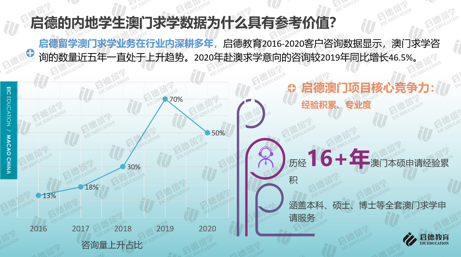 啟德留學(xué)2016-2020客戶服務(wù)數(shù)據(jù)顯示,澳門求學(xué)咨詢量近五年一直處于上升趨勢,2020年咨詢量較2019年同比增長46.5%。2021年10月31日,啟德留學(xué)在北京發(fā)布《2021中國澳門求學(xué)報告》,這也是行業(yè)內(nèi)首次針對中國內(nèi)地學(xué)生赴澳門求學(xué)情況進行的梳理與分析,《報告》結(jié)合澳門高校官方數(shù)據(jù)及最近四年啟德學(xué)生澳門求學(xué)申請與錄取數(shù)據(jù),重點分析了澳門求學(xué)的申請要求與錄取趨勢、澳門六大高校的特色與優(yōu)勢專業(yè)、澳門本地就業(yè)情況,并就赴澳門求學(xué)規(guī)劃、申請準備及求職就業(yè)等方面提供了建議。