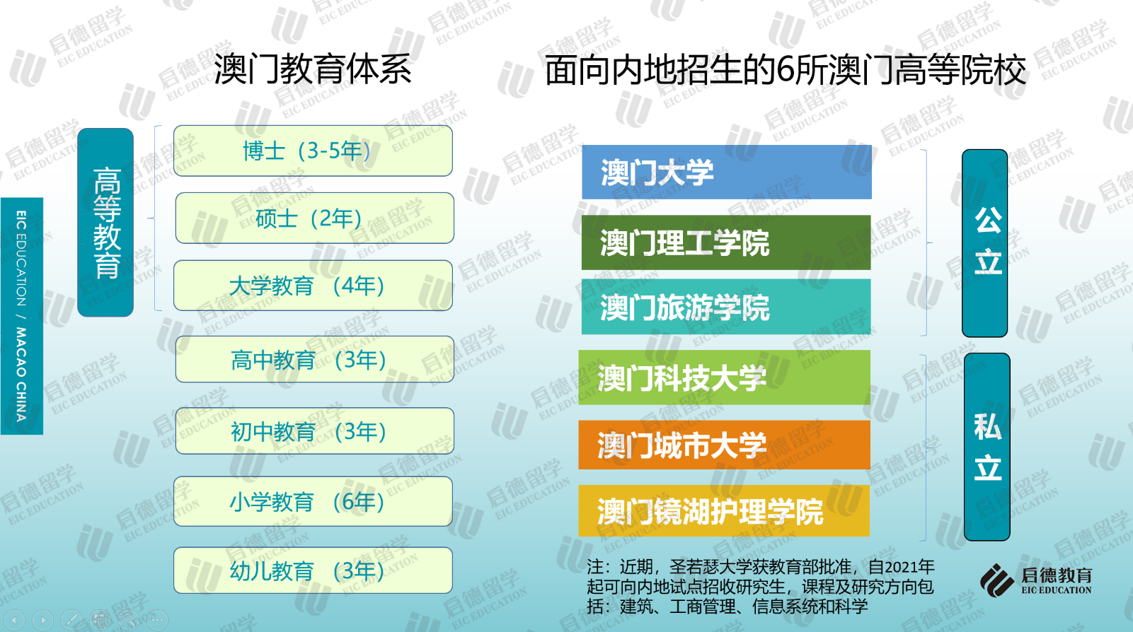 作為中西文化交匯的國際旅游城市,中國澳門的輕工業(yè)、旅游業(yè)、酒店業(yè)和娛樂場使其成為中外游客青睞的旅游度假勝地。澳門與香港同樣都具有獨特的地緣優(yōu)勢,既有中國文化的根基,又融會貫通了歐美教育的優(yōu)勢,中文、葡文、英文學(xué)制并存的多語言教學(xué)與多元文化交融的國際化環(huán)境,為學(xué)生提供了開闊的國際視野和學(xué)術(shù)氛圍,也為當(dāng)?shù)馗叩冉逃陌l(fā)展創(chuàng)造了良好的條件。目前,澳門大學(xué)、澳門理工學(xué)院、澳門旅游學(xué)院、澳門城市大學(xué)、澳門鏡湖護理學(xué)院、澳門科技大學(xué)等6所高校獲教育部批準可面向內(nèi)地招收本科生及研究生,圣若瑟大學(xué)獲教育部批準自2021年起可面向內(nèi)地試點招收研究生。