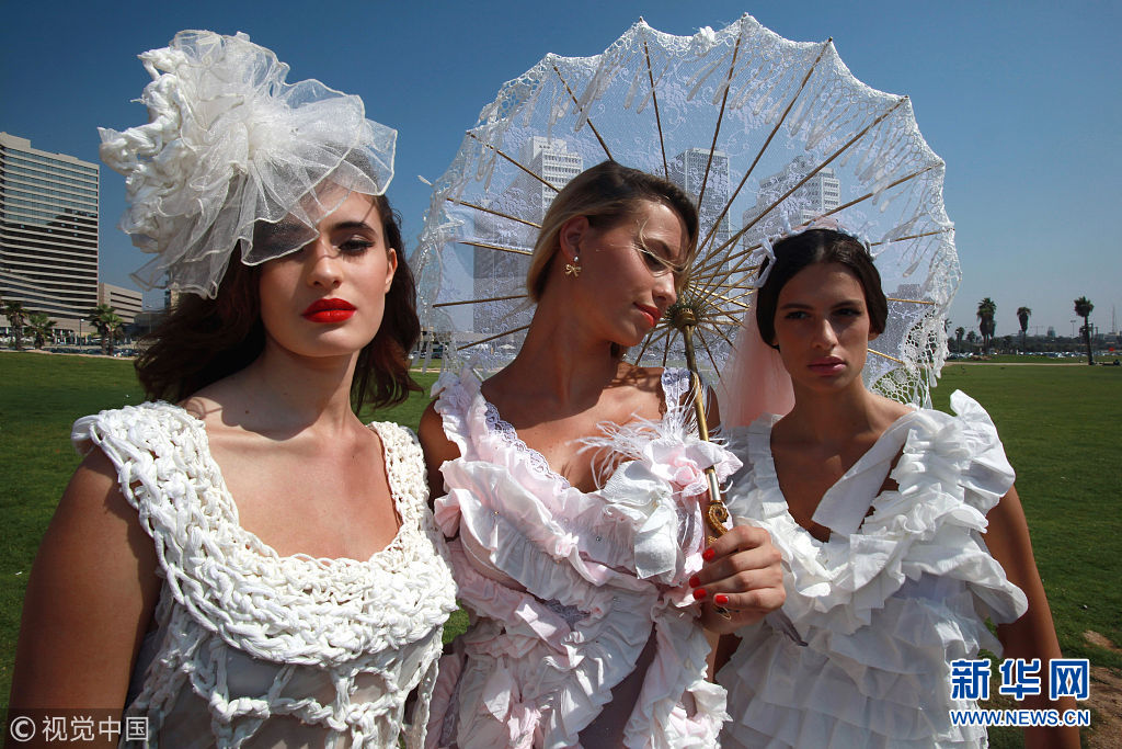 ????特拉維夫,模特身上穿著手紙制作的婚紗。9月9日是個大吉之日,大批新人將會在當(dāng)日扎堆結(jié)婚。(圖片來源:視覺中國)