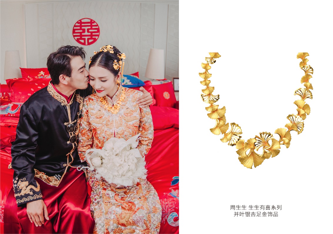 良辰吉時,鳴鳳鏘鏘。每一個喜字,每一抹紅色,都將成為這場愛情的最好詮釋。迎親環(huán)節(jié),楊爍夫婦兩人身著中式禮服,金色圖騰配以富貴花朵刺繡,與生生有喜系列并葉銀杏足金項鏈及耳環(huán)相輔相成,搭配新娘清麗的妝容,散發(fā)著中國女性傳統(tǒng)古典的東方美。鳳冠霓裳,纓絡垂旒,配上生生有喜系列足金龍鳳手鐲,經(jīng)典的搭配亦不失傳承的意義,寓意龍鳳呈祥,成雙成對。