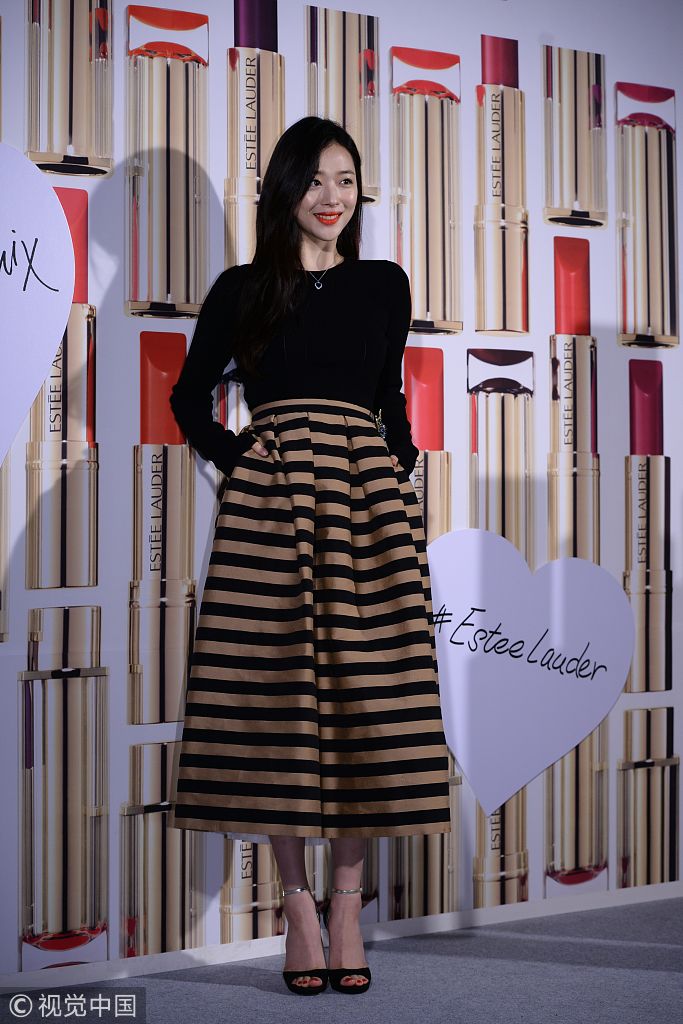 2017年4月5日訊,韓國首爾,5日,雪莉出席某美妝品牌活動。身穿黑色修身緊身針織衫,下穿棕色黑色橫條紋蓬蓬裙,腳穿麂皮金色一字帶魚嘴細跟高跟鞋。