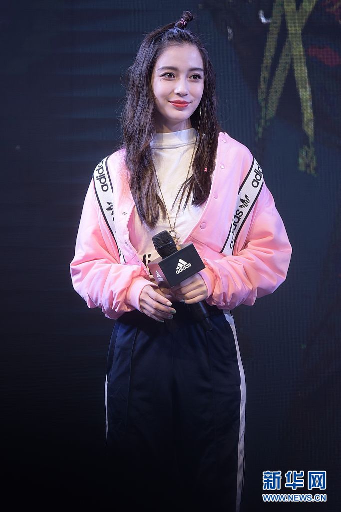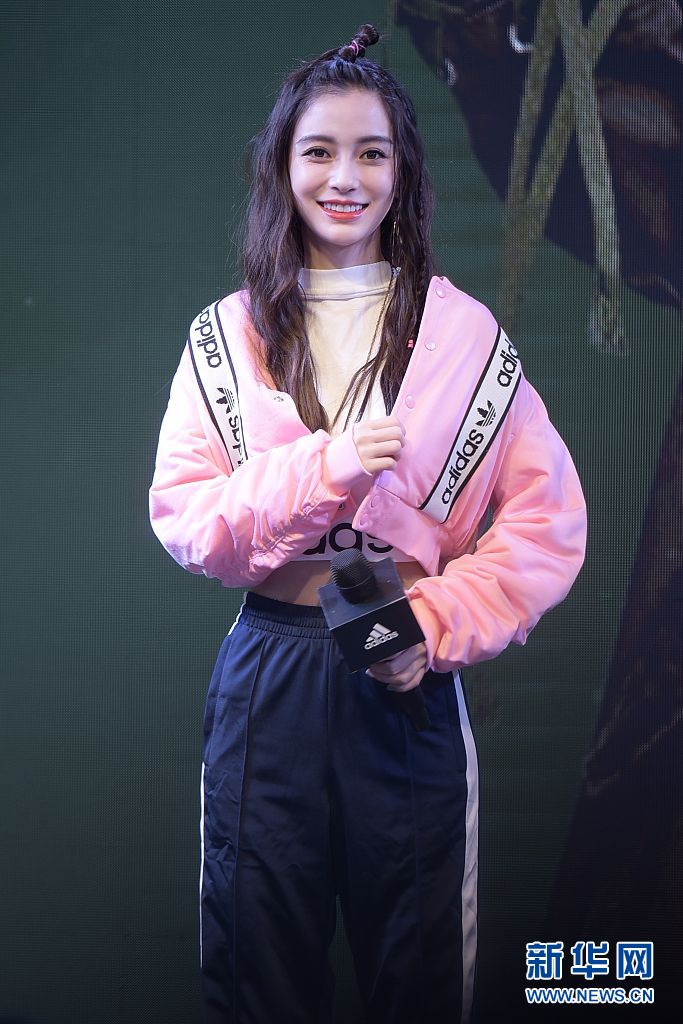 Angelababy粉色夾克+運(yùn)動褲 梳蘋果頭嬌俏