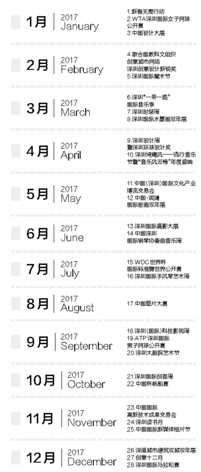 往細里說,“城市文化菜單”呈現(xiàn)出鮮明亮點:一是國際化程度高。大部分活動都有國際權(quán)威和國家級專業(yè)機構(gòu)主辦或授權(quán)支持,不少活動代表了我國這一領(lǐng)域的最高水準,是可以代表深圳國際化城市形象的“文化大餐”。二是內(nèi)容豐富多彩。這份“菜單”表面上看只有28項,實際上每項活動時間跨度從幾天到一個多月不等,由十?dāng)?shù)項甚至上百項活動組成,各款“菜式”都有,不同口味的人都可以自行“看單點菜”。三是體現(xiàn)深圳特色?!安藛巍敝杏腥种坏幕顒优c創(chuàng)新創(chuàng)意有關(guān),正好體現(xiàn)了深圳“創(chuàng)新之城”、“設(shè)計之都”的城市特性,可謂是深圳的文化“特產(chǎn)”。四是新的品牌活動首次集體亮相。經(jīng)過多年培育,深圳已經(jīng)擁有文博會、高交會、讀書月、創(chuàng)意12月等傳統(tǒng)品牌活動,接下來還要精心打造一系列新的文化品牌活動。在這份“菜單”中,2016年及今年新創(chuàng)辦的就有深圳“一帶一路”國際音樂季、深圳國際科技影視周、深圳國際攝影大展、深圳設(shè)計周、中國圖片大賽等多項活動,文博會、新春關(guān)愛行動、國際魔術(shù)節(jié)等老牌活動也都將有新的策劃、新的提升,更具國際化內(nèi)涵。一句話,這份菜單共匯集了國際化、標志性的品牌文化活動28項,涵蓋文化藝術(shù)、創(chuàng)意設(shè)計、科技創(chuàng)新、體育休閑等多個類別,是廣義的文化活動的概念。