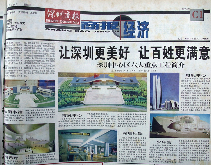 1998年12月29日,深圳商報(bào)頭版報(bào)道深圳中心區(qū)六大重點(diǎn)工程開工