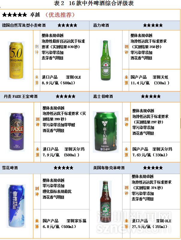 16款中外啤酒中,6款評級五星,國產(chǎn)與進口各3款,分別為:德國自然渾濁型小麥啤酒 、喜力啤酒 、丹麥FAXE王室啤酒 、嘉士伯啤酒、 雪花啤酒、美國布魯克林啤酒。獲得四星評級的有6款,國產(chǎn)5款進口1款,4款三星評級均為進口啤酒。另外,16款中外啤酒均未出現(xiàn)違規(guī)使用添加劑和污染物超標(biāo)情況,均符合國家食品安全標(biāo)準(zhǔn),甲醛含量均優(yōu)于國標(biāo)要求。