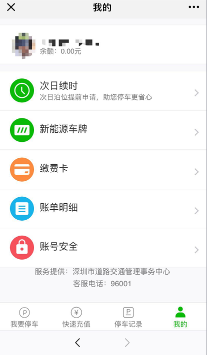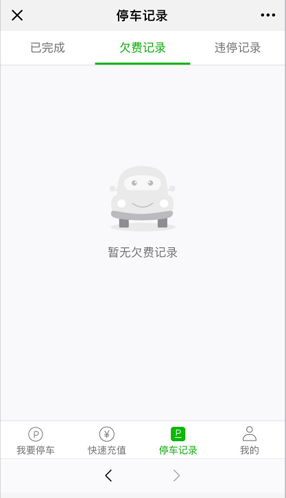 在這個界面還有“快速充值、停車記錄、我的”等導航入口