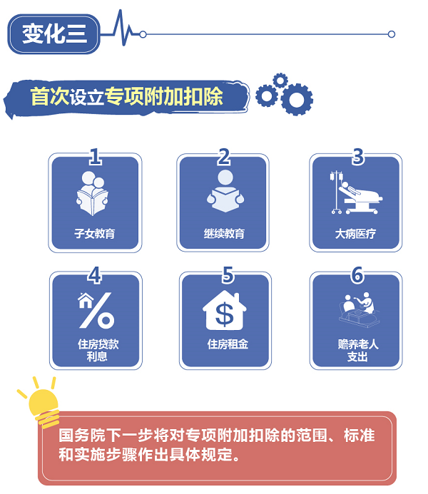 此次個(gè)稅改革還首次設(shè)立專項(xiàng)附加扣除,這是改革的突出亮點(diǎn),圍繞與群眾生活密切相關(guān)的支出領(lǐng)域,在現(xiàn)行稅法基本養(yǎng)老、醫(yī)療、失業(yè)保險(xiǎn)金和住房公積金稅前扣除的基礎(chǔ)上,額外增加子女教育、繼續(xù)教育、大病醫(yī)療、住房貸款利息或住房租金、贍養(yǎng)老人等6項(xiàng)專項(xiàng)附加扣除,將進(jìn)一步增強(qiáng)稅制的公平合理性。根據(jù)稅法授權(quán),國(guó)務(wù)院下一步將對(duì)專項(xiàng)附加扣除的范圍、標(biāo)準(zhǔn)和實(shí)施步驟作出具體規(guī)定。