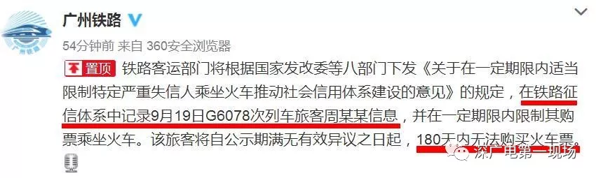 據(jù)@廣州鐵路今天上午10點(diǎn)25分通報(bào)稱,鐵路客運(yùn)部門將根據(jù)國(guó)家發(fā)改委等八部門下發(fā)《關(guān)于在一定期限內(nèi)適當(dāng)限制特定嚴(yán)重失信人乘坐火車推動(dòng)社會(huì)信用體系建設(shè)的意見》的規(guī)定,在鐵路征信體系中記錄9月19日G6078次列車旅客周某某信息,并在一定期限內(nèi)限制其購票乘坐火車。