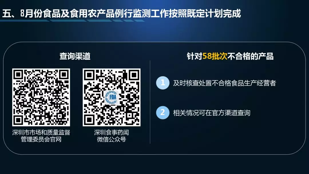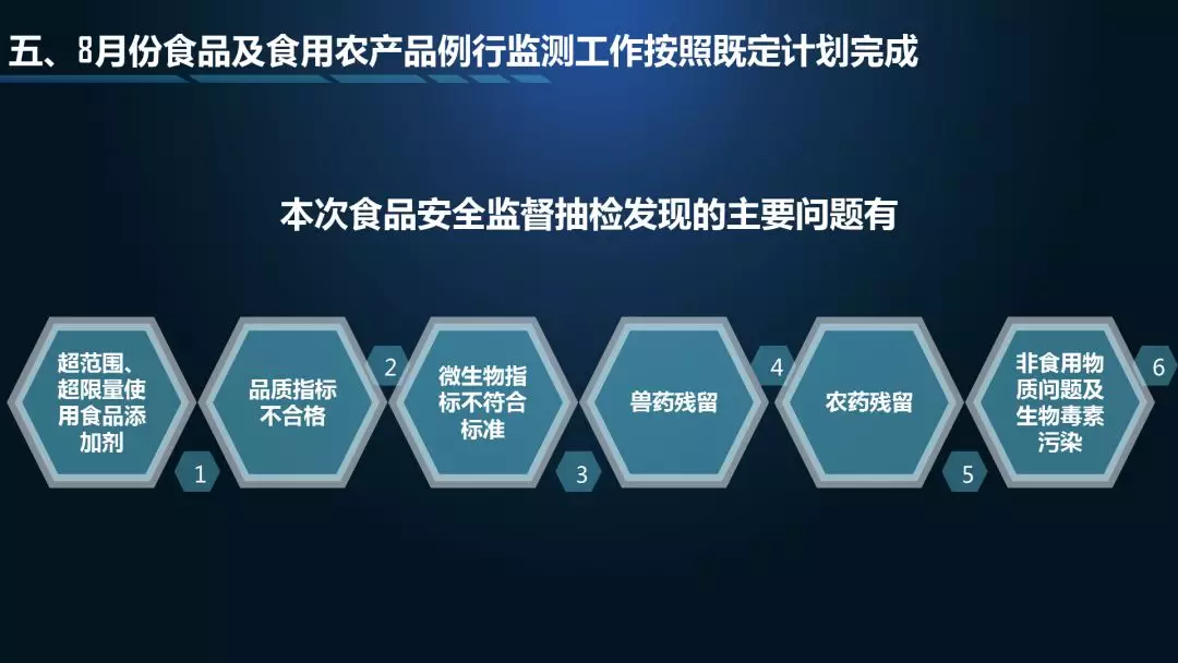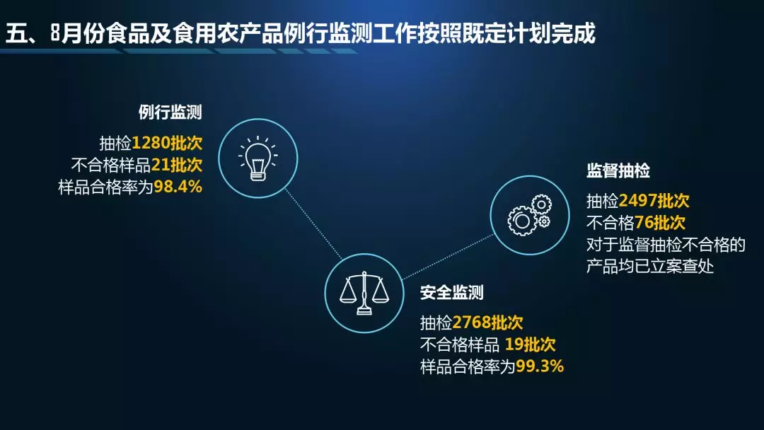 第二個“3”是三項檢測結(jié)果通報,分別是中秋、國慶的特別監(jiān)測通報,8月份食品例行監(jiān)測通報,8月份食用農(nóng)產(chǎn)品例行監(jiān)測通報;