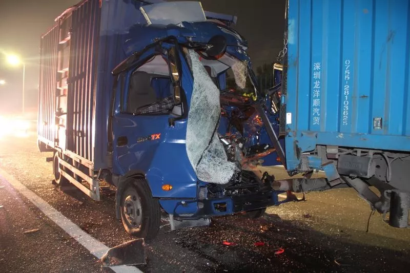 2.此類事故往往體現(xiàn)出追尾貨車速度明顯高于前方車輛的車速,且后車因未及時發(fā)現(xiàn)前方情況采取制動措施,導(dǎo)致碰撞時后車的駕駛室嚴(yán)重變形,司機(jī)身體受到擠壓,造成駕駛?cè)藗觥?/p>