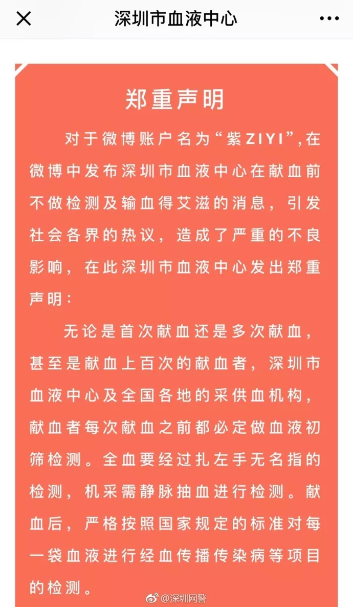 日前,微博名為“紫ZIYI”網(wǎng)友聲稱(chēng)其在深圳獻(xiàn)血未做血液檢查。