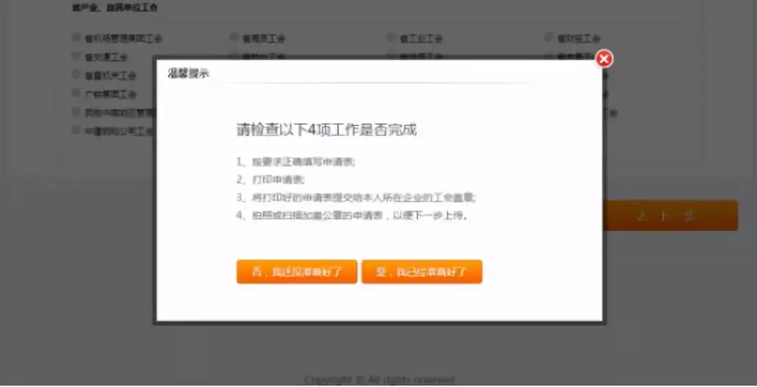 2.根據(jù)“溫馨提示”確認(rèn)是否已完成,如果未完成,點擊【否,我還沒準(zhǔn)備好】,并隨后完成所有工作;如果已完成,點擊【是,我已經(jīng)準(zhǔn)備好了】,進(jìn)入下一個頁面。在申報過程中,長時間在網(wǎng)站頁面停留,會遇到頁面過期,遇到此問題需重新登錄;