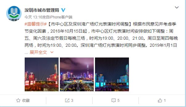 近期,深圳燈光秀表演刷屏朋友圈。今天(10月14日)13時(shí),深圳市城市管理局發(fā)布通知稱,根據(jù)市民意見(jiàn)并考慮季節(jié)變化因素,10月15日起,深圳市中心區(qū)及深圳灣廣場(chǎng)燈光表演時(shí)間調(diào)整。