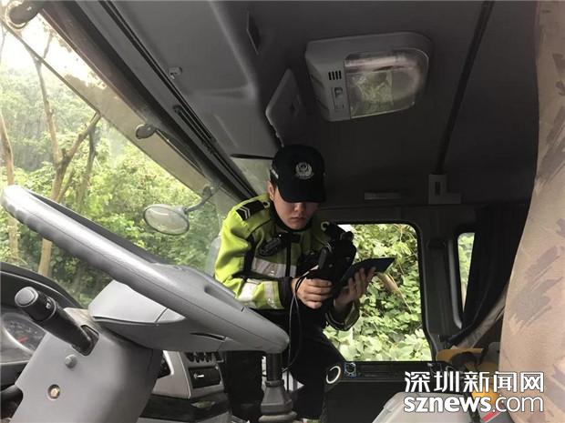 深圳交警民警檢查泥頭車駕駛員的相關(guān)證件