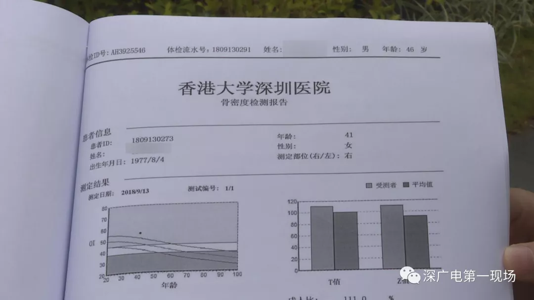 李先生也向記者展示了自己的這份體檢報(bào)告,在體檢報(bào)告的封面上,確實(shí)是李先生的信息,然而就在骨密度的檢查結(jié)果頁面中,顯示了一位女性的個(gè)人信息,其中名字年齡都有,但是在頁眉上,還是李先生的體檢流水單號(hào)。