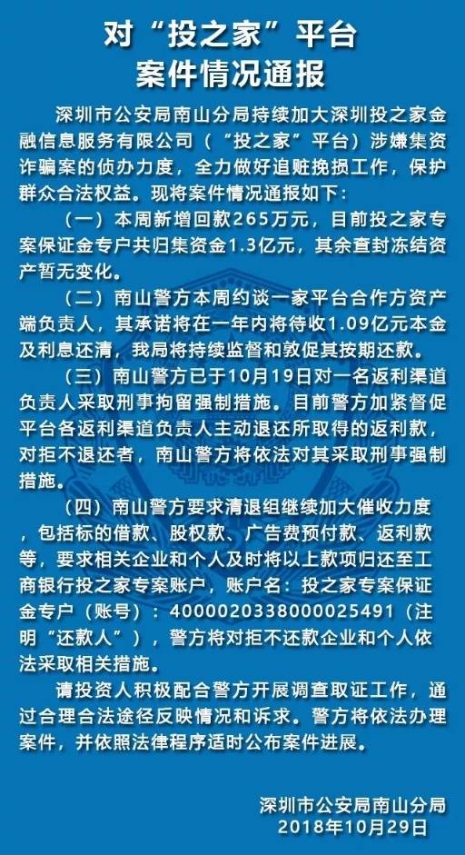 10月29日,深圳南山公安通報五家涉嫌非法集資犯罪的P2P平臺案件情況。五家平臺分別是“中融投”“投之家”“零錢罐”“利民網(wǎng)”“金融圈”平臺。
