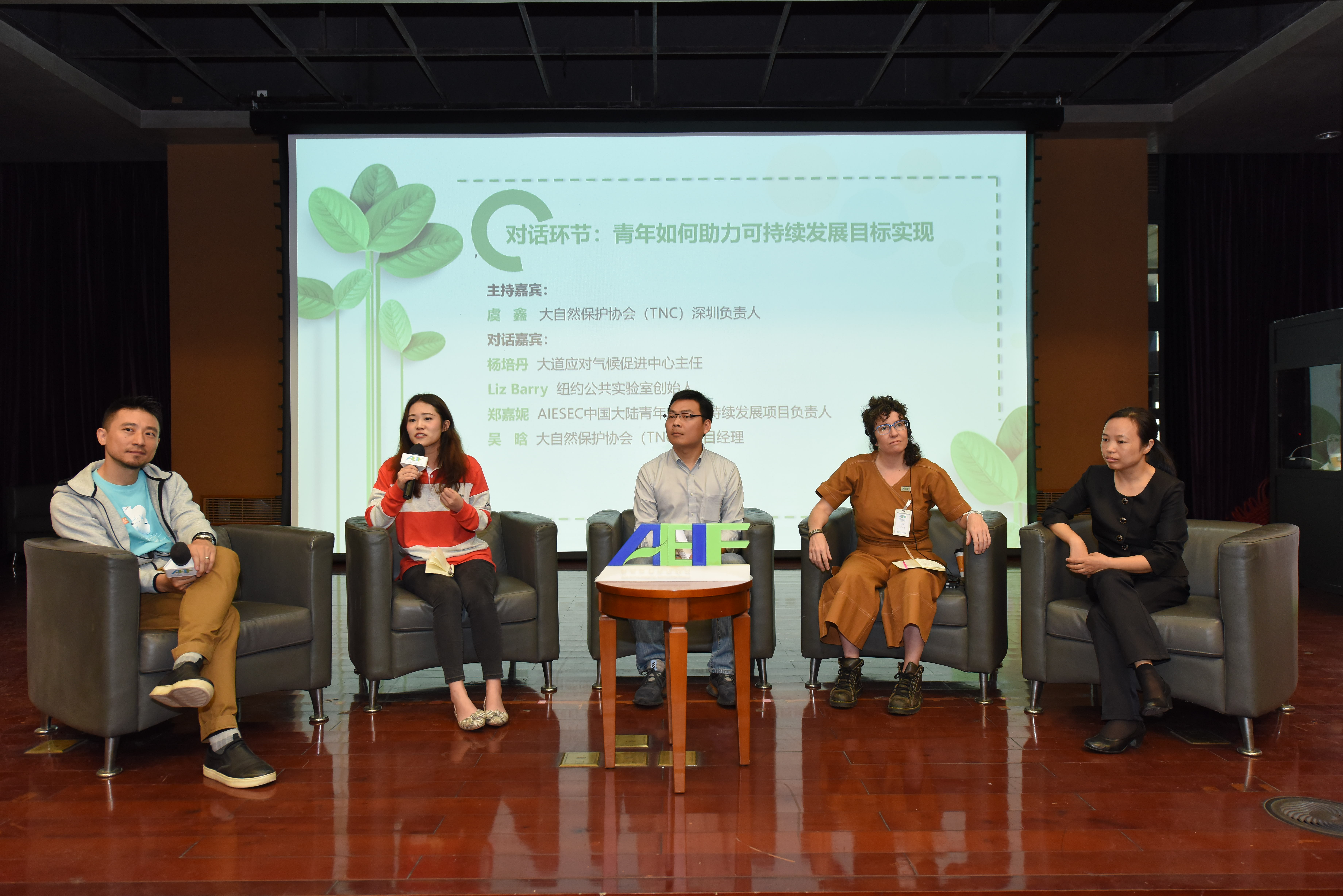 對(duì)話環(huán)節(jié)“青年如何助力可持續(xù)發(fā)展目標(biāo)實(shí)現(xiàn)”共有6位嘉賓參與。在主持嘉賓大自然保護(hù)協(xié)會(huì)(TNC)深圳保護(hù)項(xiàng)目負(fù)責(zé)人虞鑫先生的帶領(lǐng)下,大道應(yīng)對(duì)氣侯促進(jìn)中心主任楊培丹、紐約公共實(shí)驗(yàn)室創(chuàng)始人Liz Barry、AIESEC中國大陸青年獻(xiàn)力可持續(xù)發(fā)展項(xiàng)目負(fù)責(zé)人鄭嘉妮、大自然保護(hù)協(xié)會(huì)(TNC)項(xiàng)目經(jīng)理吳晗參與了分享交流。