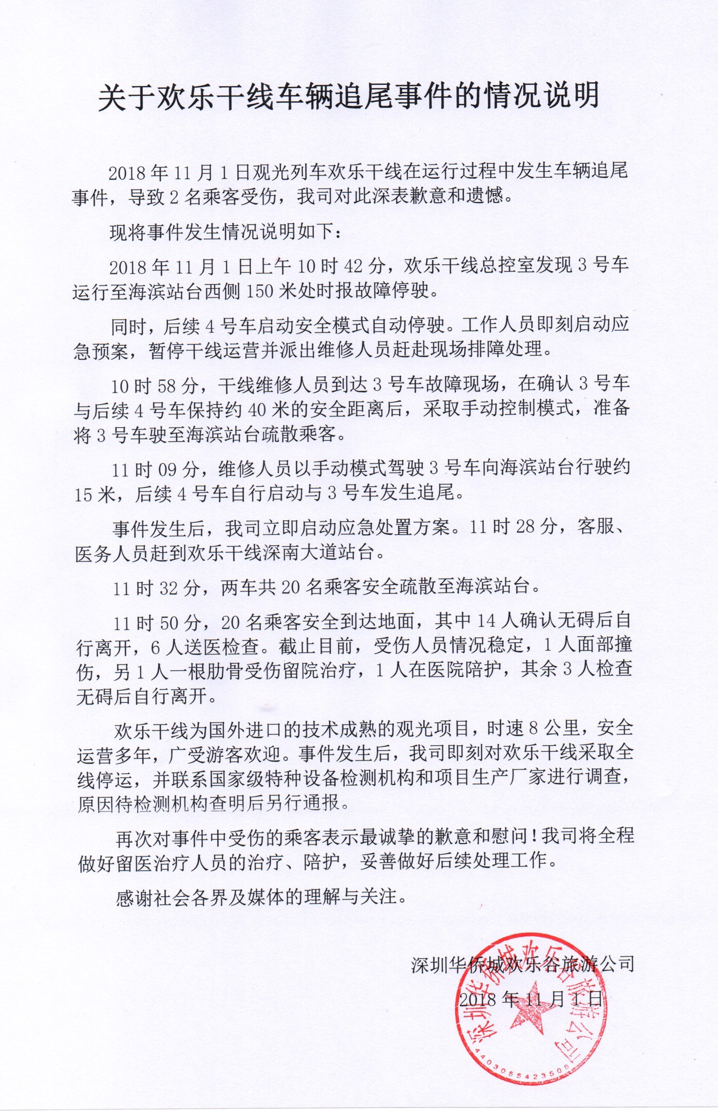 11月1日19時,記者收到深圳華僑城歡樂谷旅游公司就此次事件發(fā)來的情況說明。歡樂谷旅游公司在說明中還原了事故發(fā)生的過程,并對受傷乘客表示歉意。