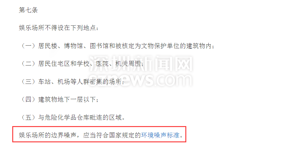 此外,該管理條例還對娛樂場所的邊界噪聲做出了明確規(guī)定,要求其邊界噪聲應(yīng)當(dāng)符合國家規(guī)定的環(huán)境噪聲標(biāo)準(zhǔn),即睡眠30分貝。