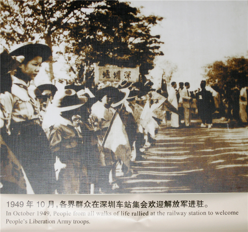 圖為居民在車站歡迎解放軍,背后可清晰地看到當(dāng)時(shí)深圳火車站的站名“深圳墟”