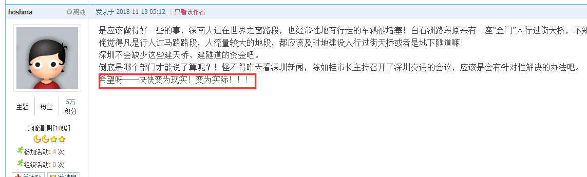 深圳新聞網(wǎng)11月13日訊(記者施冰冰)“觀察一個(gè)多月了,深南大道車公廟段的交通已是無(wú)序狀態(tài)?!?1日,網(wǎng)友“深圳大胡子”在論壇上發(fā)帖“控訴”深南大道車公廟段的交通現(xiàn)狀。(網(wǎng)帖:https://szbbs.sznews.com/thread-3817862-1-1.html)