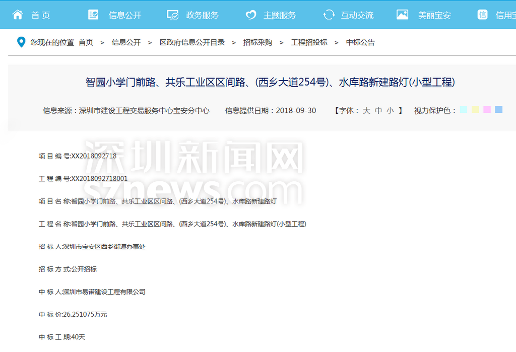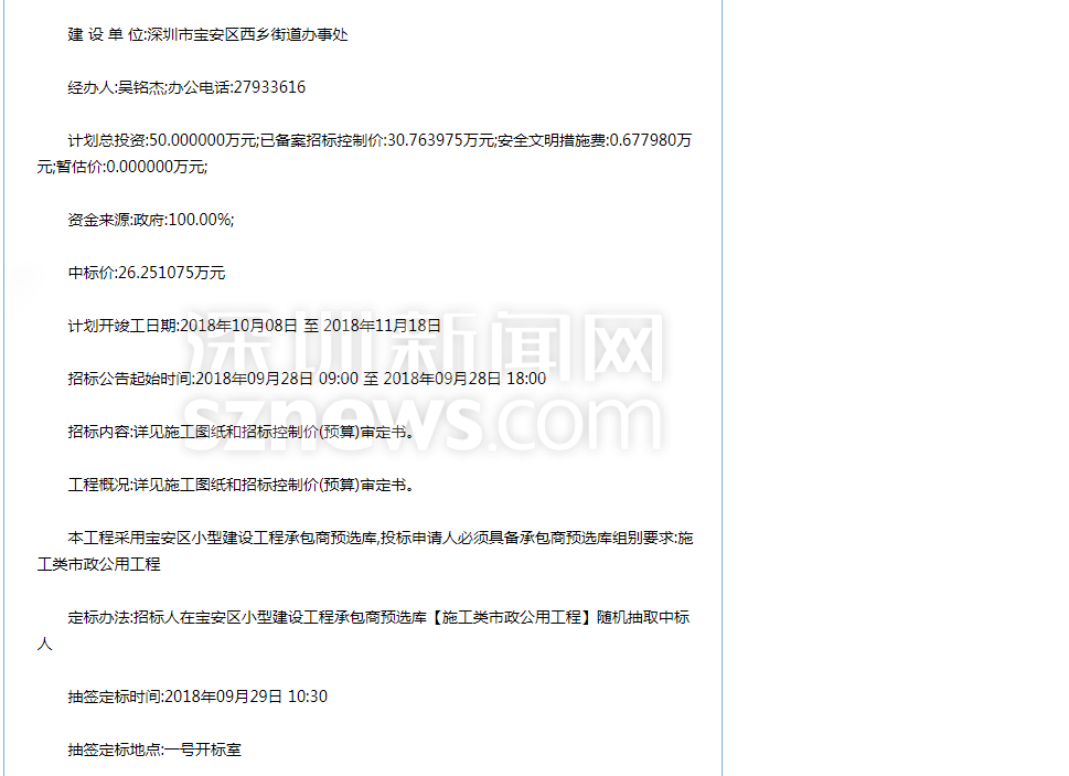 針對網(wǎng)友反映的情況,記者查閱相關(guān)資料發(fā)現(xiàn),寶安智園小學(xué)門前的施工工程于2018年9月28日公開招標(biāo)。