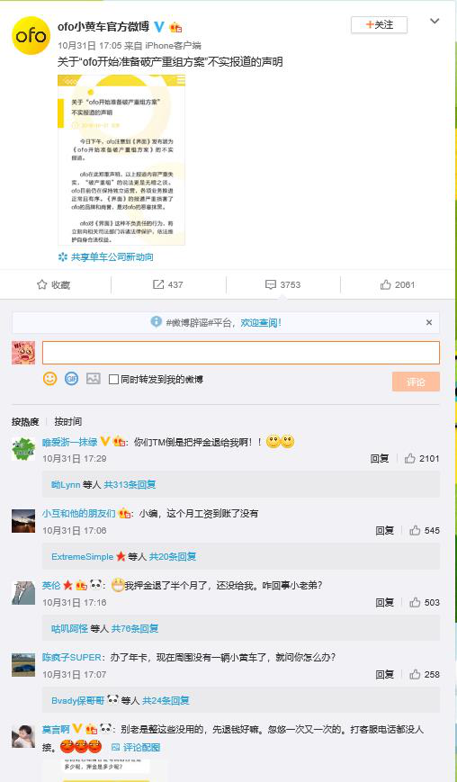 今年10月底,《界面》新聞發(fā)布題為《ofo開始準(zhǔn)備破產(chǎn)重組方案》的報道。當(dāng)日,ofo官微稱該報道嚴(yán)重失實,將訴諸法律維護自身合法權(quán)益。