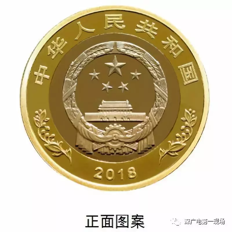雙色銅合金紀(jì)念幣正面圖案為國徽,國徽上方刊“中華人民共和國”國名,下方刊年號“2018”字樣,左右兩側(cè)為果實(shí)圖案。