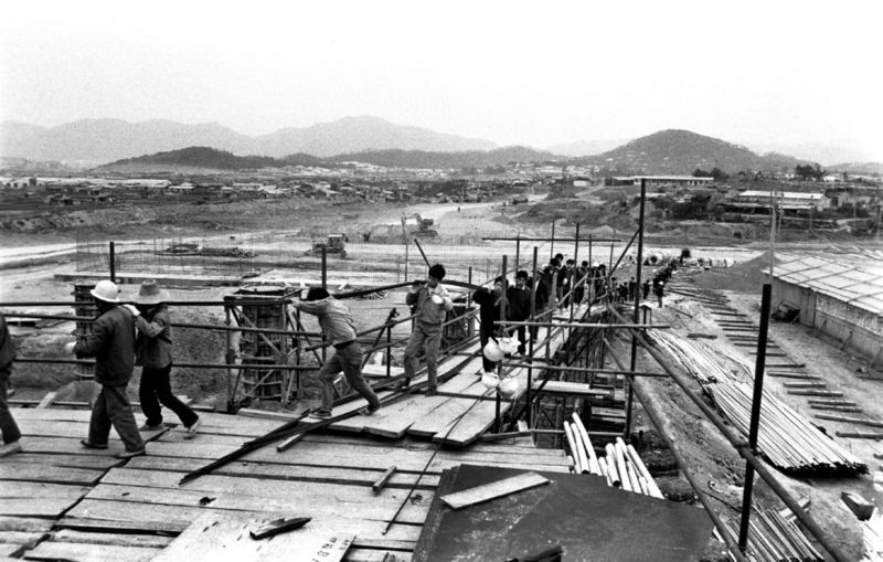 1992年,中心區(qū)四橋一廣場進(jìn)入緊張施工,圖為金田立交橋的施工情景,背景是蓮花山。 馬樹華 攝