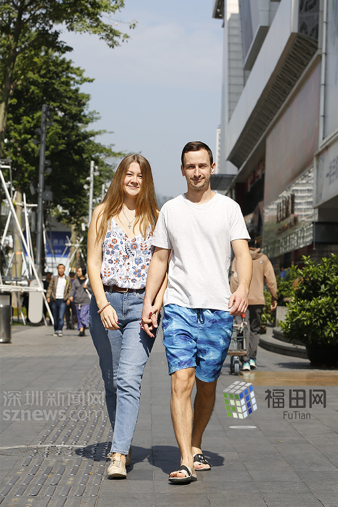 俄羅斯情侶身穿背心牛仔褲與短袖短褲,明亮的藍(lán)色依然是夏天的感覺。
