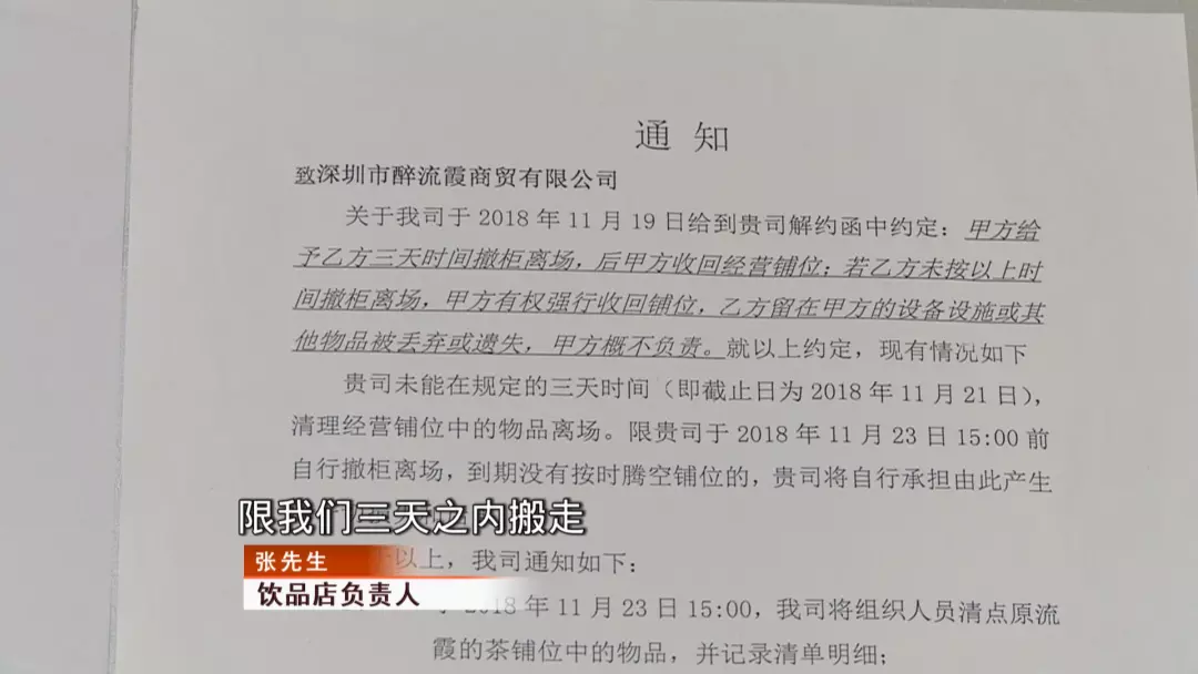 記者在飲品店墻上看到了一則通知,優(yōu)米道商場以飲品店拖欠租金為由與其解約,限飲品店在11月23日15點(diǎn)前自行離場,到期不按時(shí)騰空鋪位,飲品店將要承擔(dān)由此產(chǎn)生的一切損失和后果。