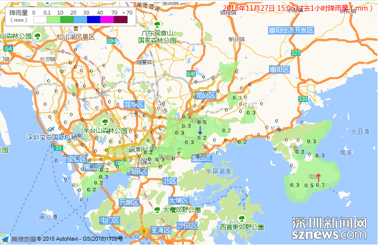 市氣象局監(jiān)測過去1小時(shí)降雨量(數(shù)據(jù)更新于11月27日15時(shí)06分)