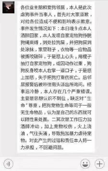 當(dāng)天深夜,男子在業(yè)主群中道歉,稱自己晚上9點(diǎn)醉酒回家,發(fā)現(xiàn)自家寵物狗掙脫狗鏈,到處拉屎還將家里的鞋子、衣物撕咬破碎,抽打自家寵物狗時,又被反咬一口,才會失手將狗打成重傷,同時男子表示“對此產(chǎn)生的過錯和責(zé)任本人將一力承擔(dān),不回避問題。”