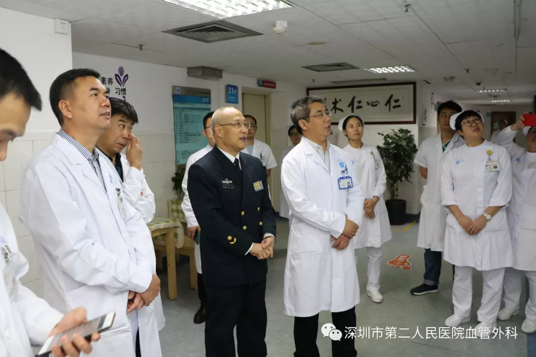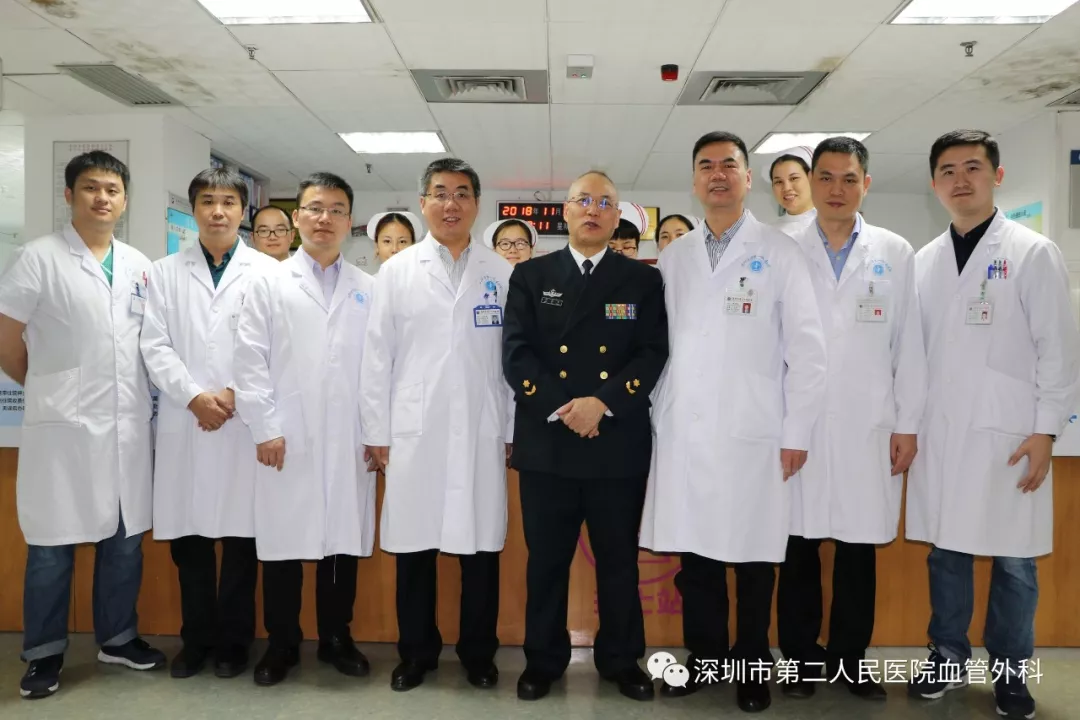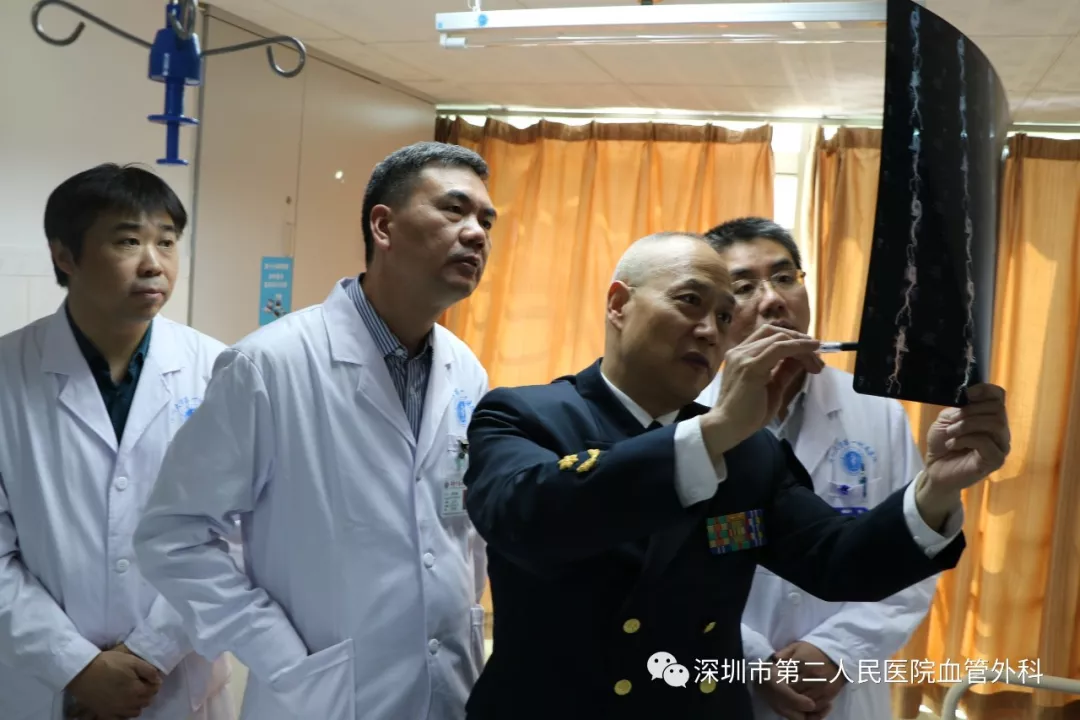座談會結束后,景在平教授、趙永勝副院長與科室醫(yī)護人員一起,進行了床邊臨床教學查房,同時為一位腹主動脈瘤疾病患者會診?;颊呤强姑涝嫌⑿郏ㄏ硎苘娂壌觯?,因發(fā)現(xiàn)腹主動脈瘤(俗稱“不定時炸彈”)后,一直深受該疾病困擾,一度不愿意接受治療。經(jīng)過景在平教授詳細講解后豁然開朗,同意接受治療,并要求在景在平教授團隊及朱國獻主任團隊下進行手術治療。會診結束時,老先生緊緊握住景在平教授的手,萬分感激。
