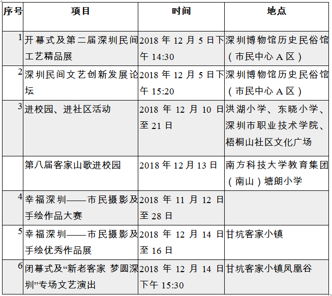 2018年12月10日至21日,將在洪湖小學(xué)、東曉小學(xué)、深圳市職業(yè)技術(shù)學(xué)院、梧桐山社區(qū)文化廣場(chǎng)舉辦4場(chǎng)進(jìn)校園、進(jìn)社區(qū)活動(dòng),組織民間藝術(shù)家表演客家山歌、陶笛、葫蘆絲、排簫、鋸琴、口哨、葉哨、粵曲,展示剪紙、剪影、臉譜繪制技藝,并現(xiàn)場(chǎng)與觀眾進(jìn)行互動(dòng)體驗(yàn)。