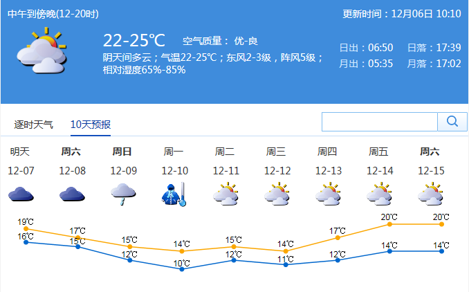 市氣象局發(fā)布未來十天天氣預(yù)報(數(shù)據(jù)更新于12月06日10時10分)