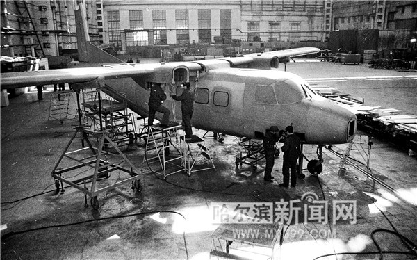 哈爾濱飛機(jī)制造公司自行研制的運(yùn)12多用途民用飛機(jī)取得了國內(nèi)首份按國際規(guī)范研制的民用飛機(jī)“型號合格證”,圖為當(dāng)年的制造車間。