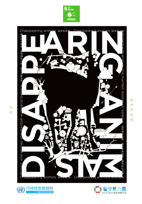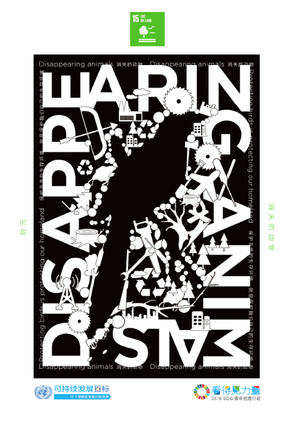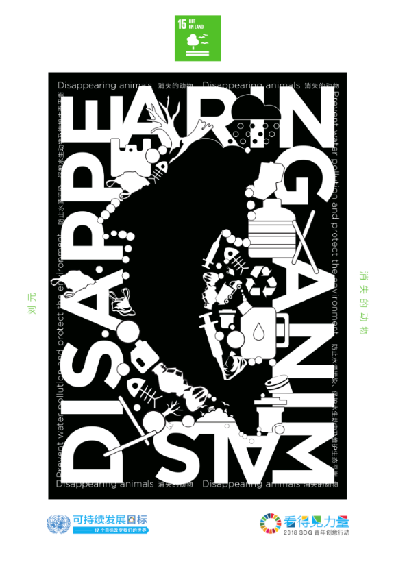 作品解釋 /隨著工業(yè)社會的飛速發(fā)展,我們面對的環(huán)境問題越來越嚴重,特別是人類的伙伴-動物更是面臨著各種環(huán)境問題在不斷減少,作品以Disappearing animals為主題結合水、陸、空三種類型動物為代表,以生活垃圾、破壞及殺害動物等各種因素為設計元素,巧妙結合為正負圖形概念來傳達海報主題,黑白視覺、傳達危機。
