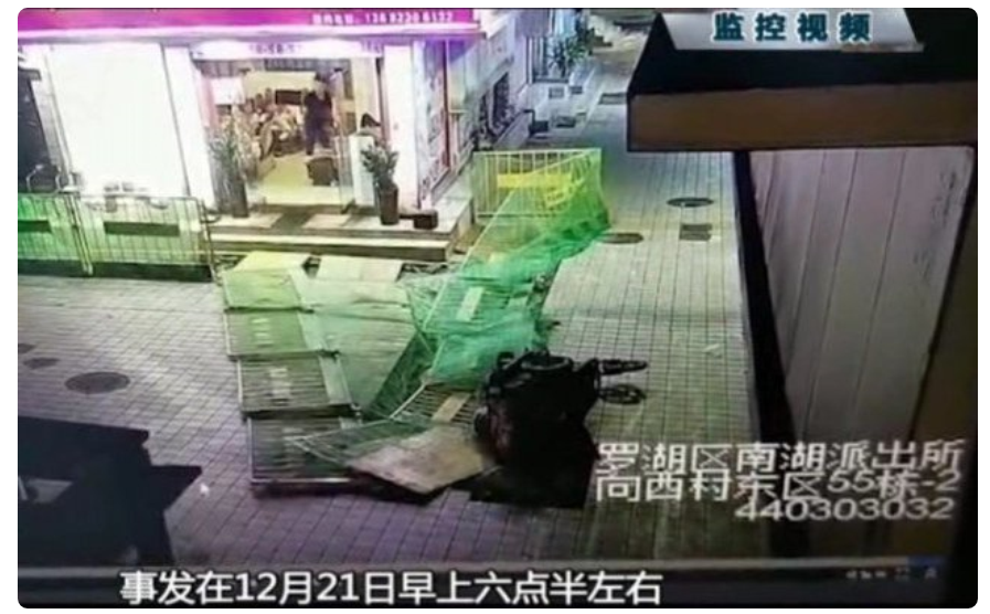 監(jiān)控視頻可見,當(dāng)時(shí)地面開挖的位置確實(shí)沒有完全圍蔽起來,護(hù)欄前亦未見警示語。