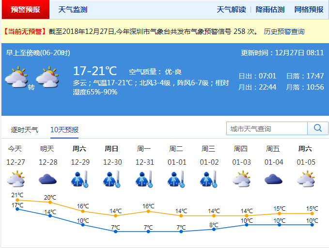 深圳新聞網(wǎng)2018年12月27日訊(記者 施冰冰)記者從市氣象局獲悉,27-28日受寒潮前鋒影響,深圳多云間晴天,風力加大,沿海和高地最大陣風6-7級,氣溫略降,早晚清涼;29日-元月2日受冷空氣主體影響,氣溫顯著下降,天氣持續(xù)寒冷,最低氣溫7℃左右,并伴有7-9級陣風和間中小雨。寒冷和大風天氣將持續(xù)5天左右。