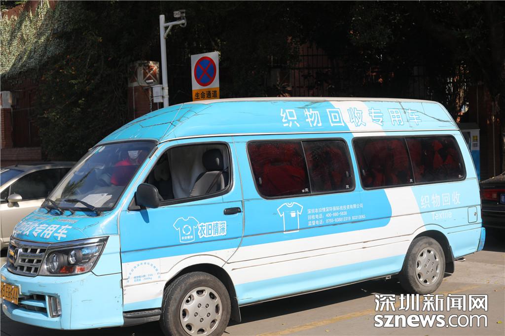在福田區(qū)梅林一村的近停車場入口處,記者在幾乎要滿的織物回收箱前等待著該公司運輸車輛的到來。不久后,一輛噴涂有織物回收專用車字樣的面包車進入了停車場。據(jù)介紹,該車輛噴涂為政府統(tǒng)一要求,進行廢舊織物回收的作業(yè)的車輛需要有統(tǒng)一的涂裝。