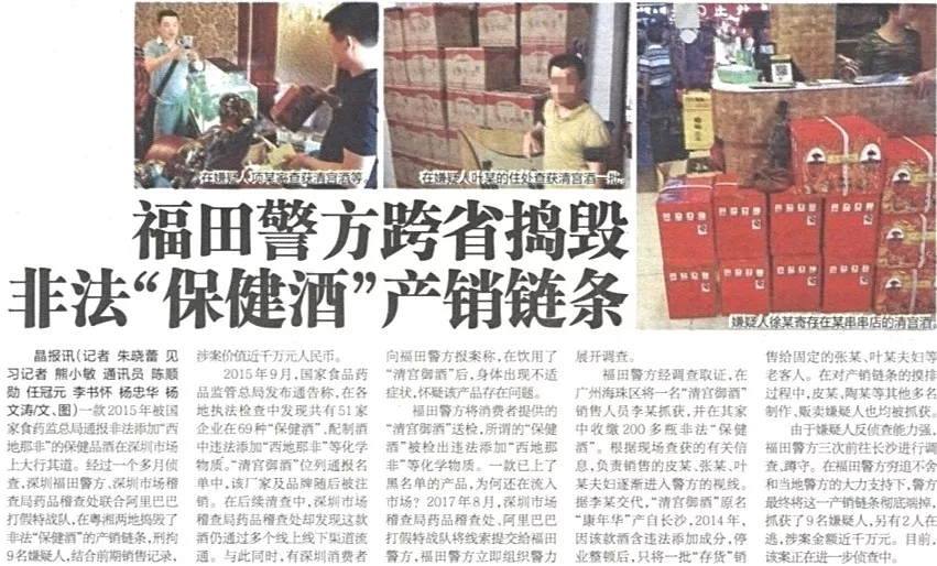 ★★福田警方聯(lián)合深圳市場(chǎng)稽查局藥品稽查處,在阿里巴巴“打假特戰(zhàn)隊(duì)”協(xié)助下,經(jīng)過一個(gè)多月偵查,于粵湘兩地?fù)v毀了非法“保健酒”的產(chǎn)銷鏈條,刑拘9名嫌疑人,涉案價(jià)值近千萬元人民幣。