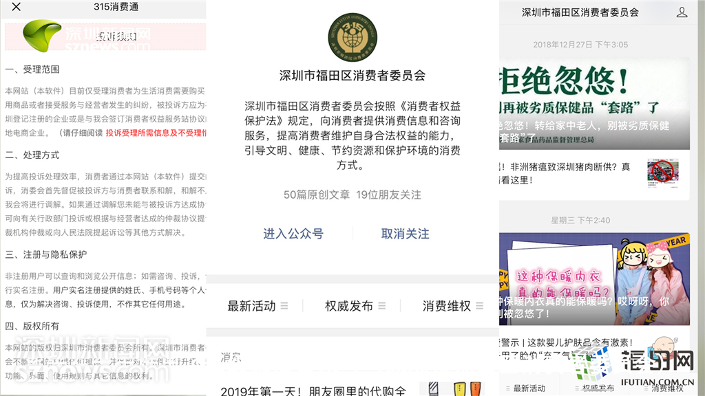 福田區(qū)消委會微信公眾號界面,包含消費維權(quán)投訴、發(fā)布消費警示等內(nèi)容。