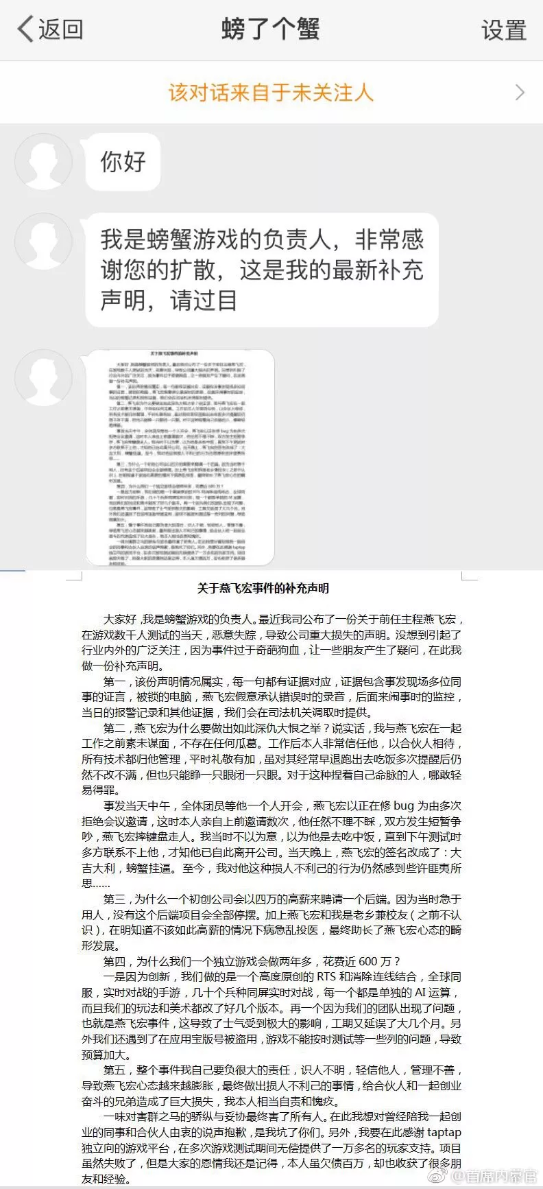 隨后,一位自稱是燕飛宏前同事的網(wǎng)友發(fā)文稱:之前的公司讓他做很簡(jiǎn)單的游戲,但是他三四個(gè)月連框架都沒寫出來,業(yè)務(wù)能力只會(huì)用老套代碼,不愿意跟同事溝通,工作很不負(fù)責(zé)任、易暴躁、打人。